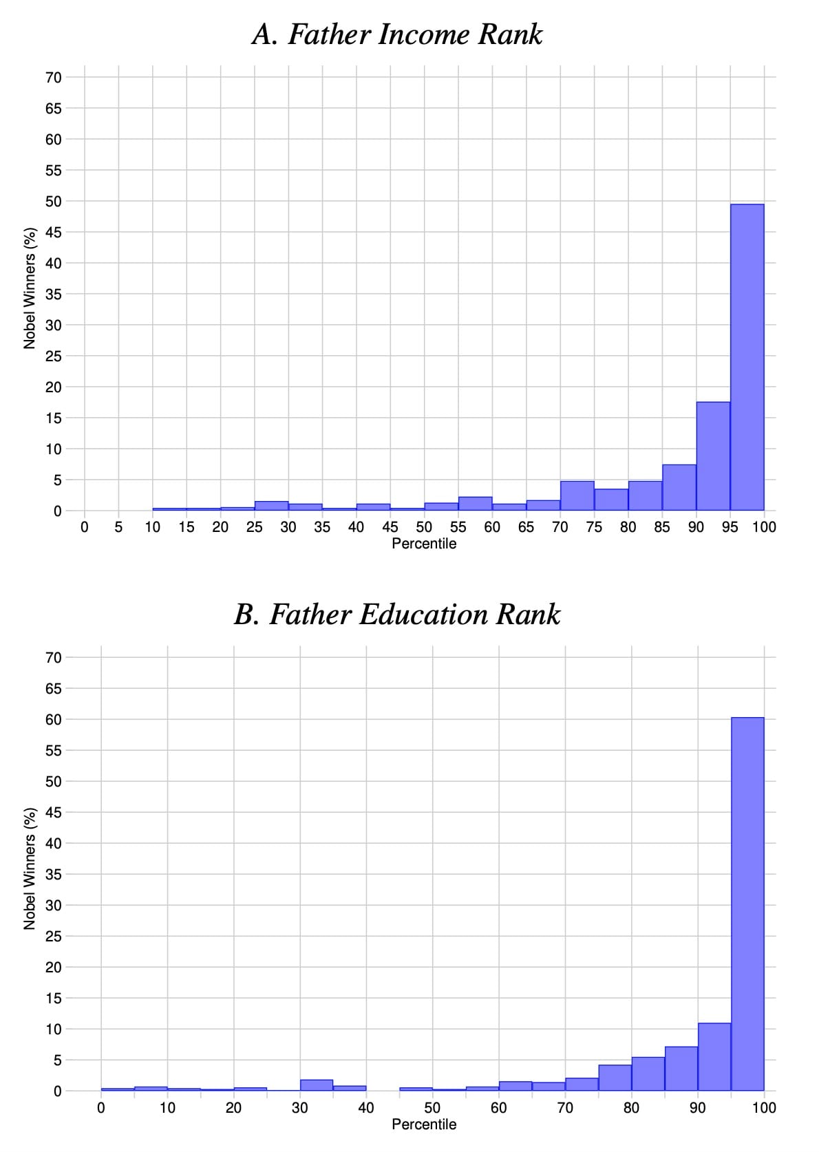 The article seeks to test these hypotheses by studying Nobel laureates (excluding the non-scientific Peace and Literature prizes). Unsurprisingly, most laureates come from very wealthy and well-educated families. The average laureate’s father is in the 87th percentile for income (earning more than 86% of the population) and the 90th percentile for education (having more education than 89% of the population). Moreover, over half of the laureates come from the top 5% of families. For women, the situation is even more striking—the average female laureate’s father is in the 91st percentile for income.