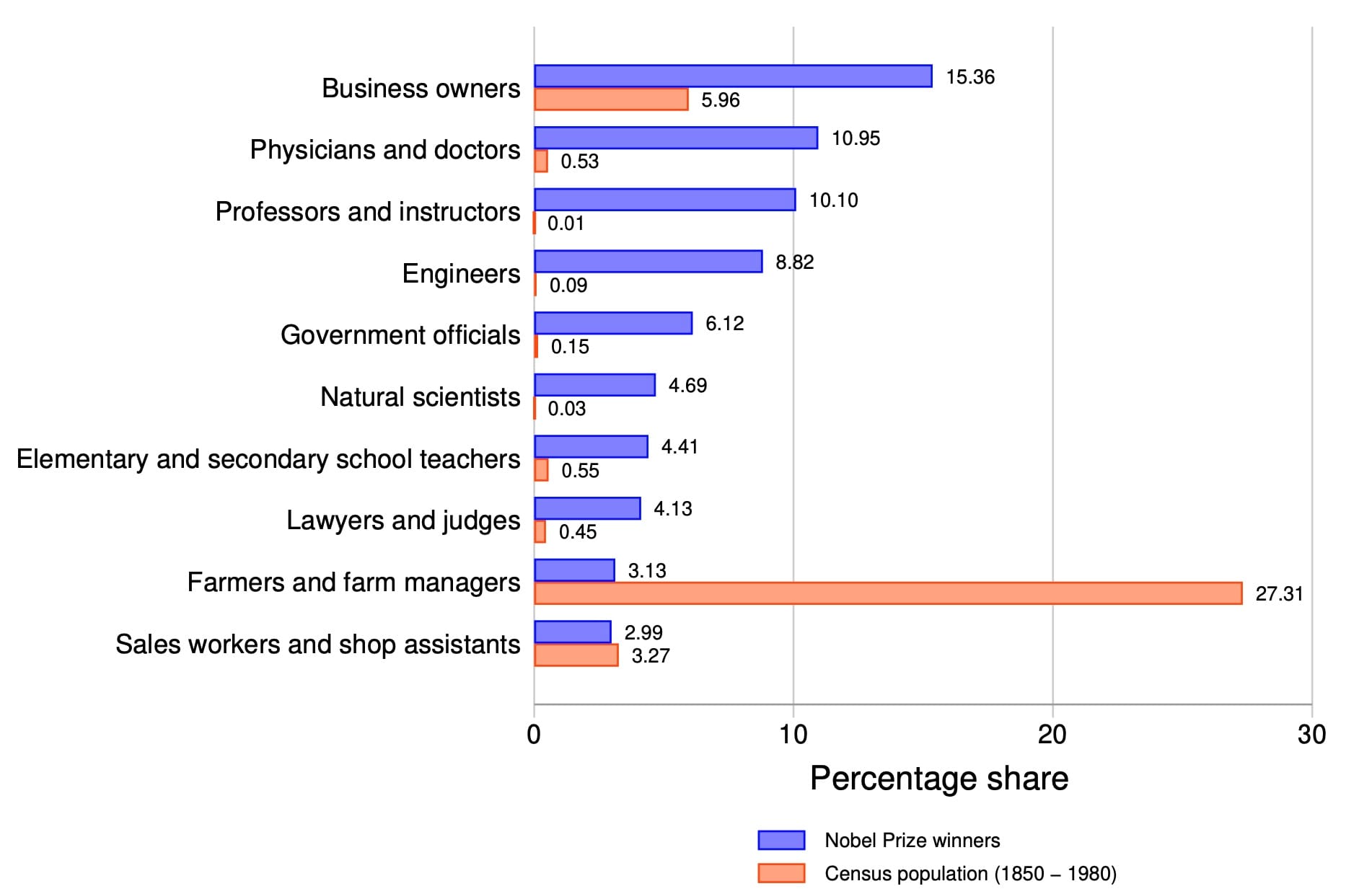In reality, to have a strong chance of winning a Nobel Prize, you are likely to have been born into a wealthy family, received the right education, and formed "academic family" ties with other Nobel laureates.