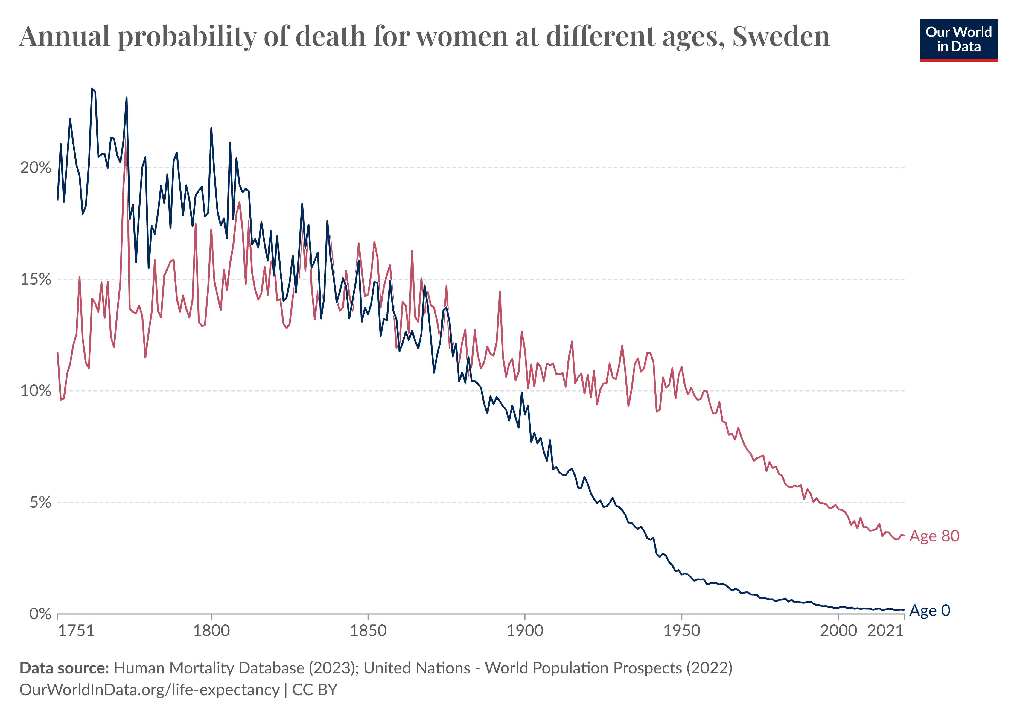 Today we have a small addition to the previous post, showing how much human mortality has changed in modern times. In the 18th century, infant mortality was higher than mortality among 80-year-olds. Over the time that has passed to the present, mortality has decreased for all age groups, but especially significantly for newborns—by 2 orders of magnitude. The pattern shown below is for females in Sweden, but is similar in other countries and for males as well.