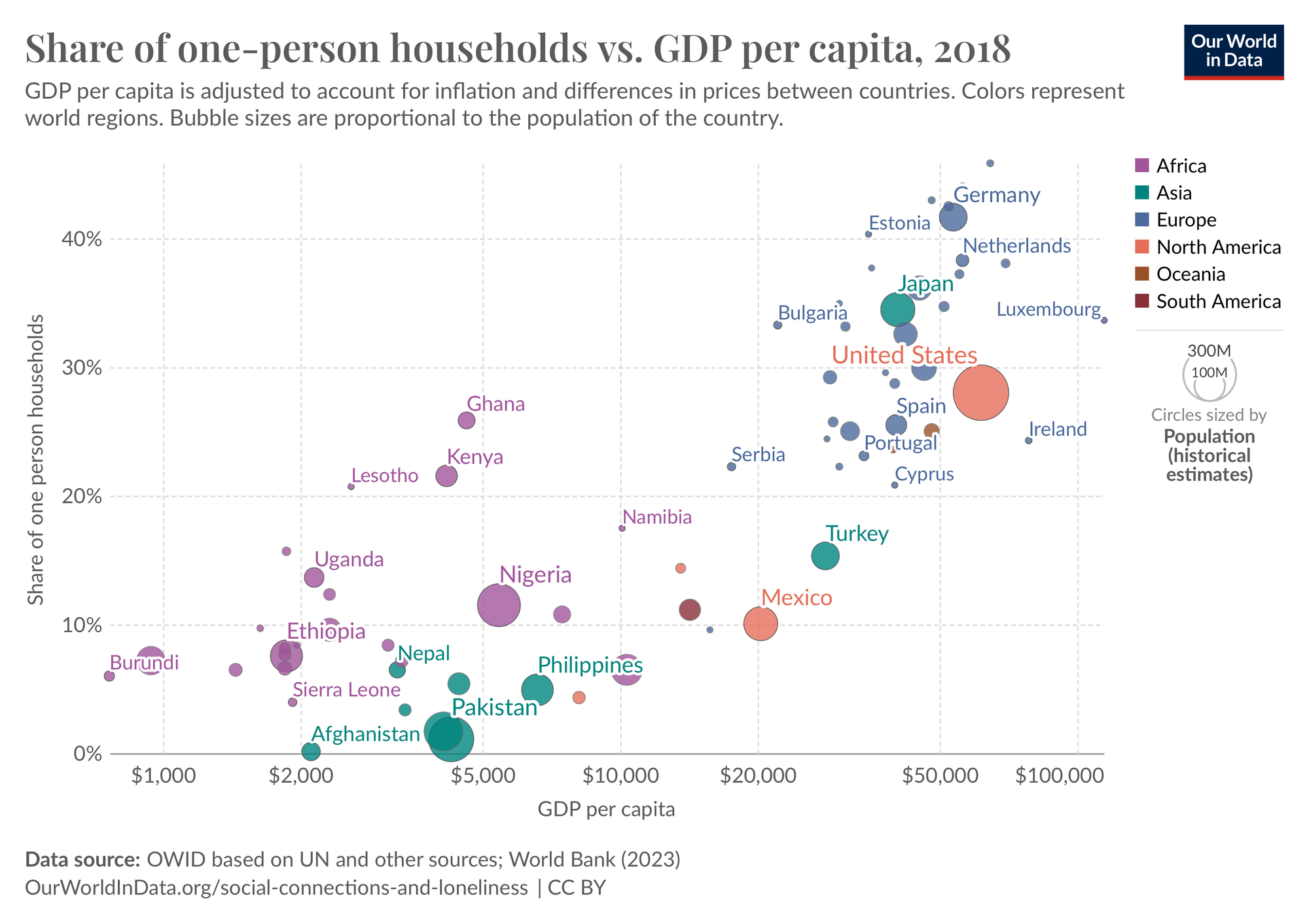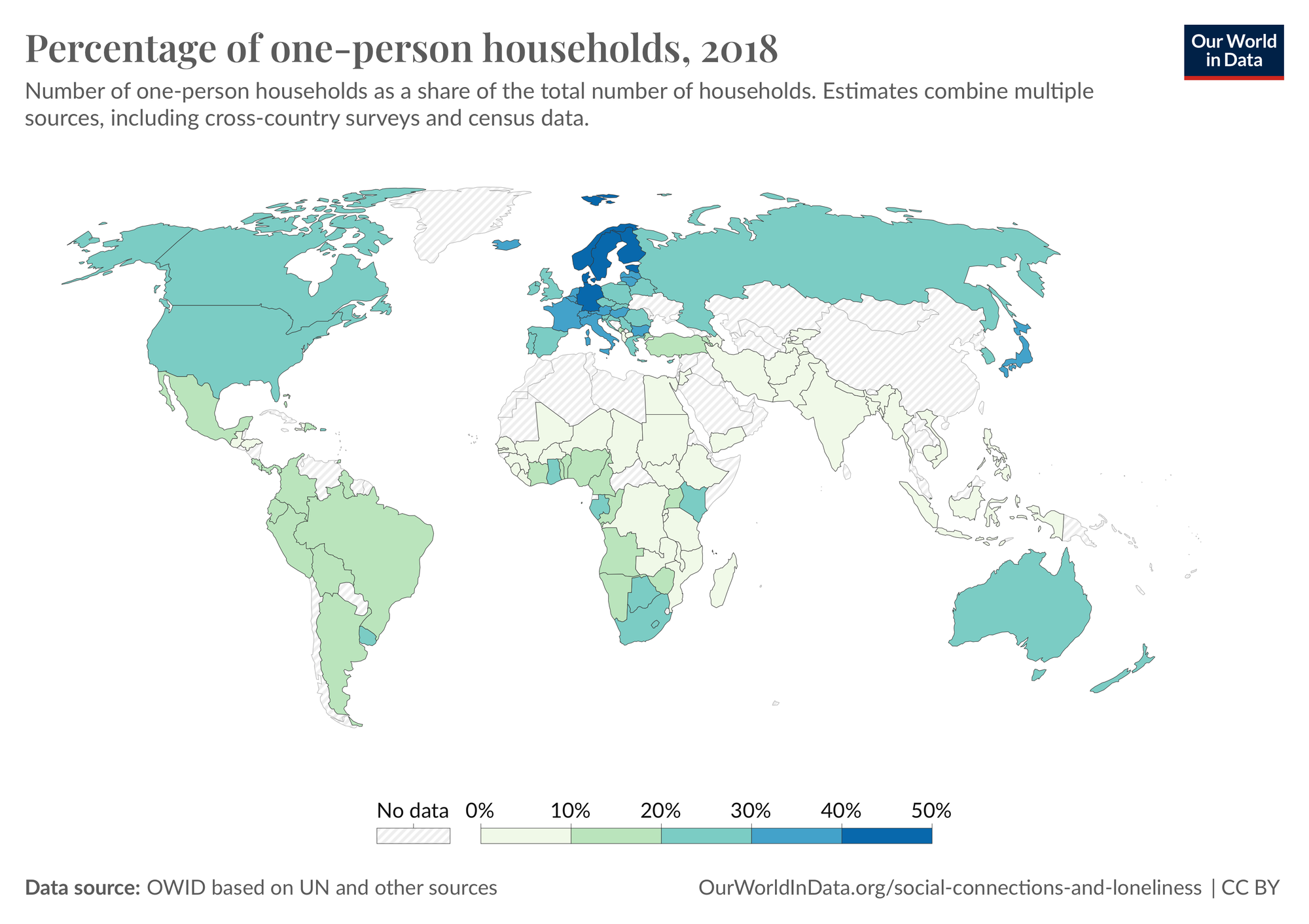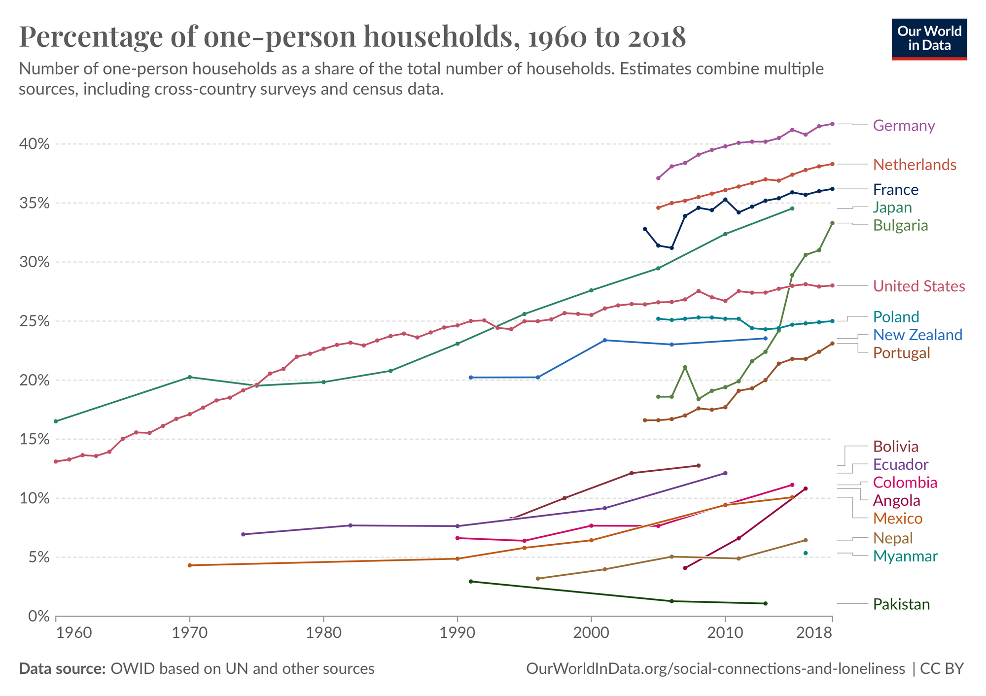 The share of such households is growing in most countries of the world, probably reflecting the gradual destruction of traditional large families and the transformation of people into being WEIRD (Western, Educated, Industrialized, Rich, Democratic).