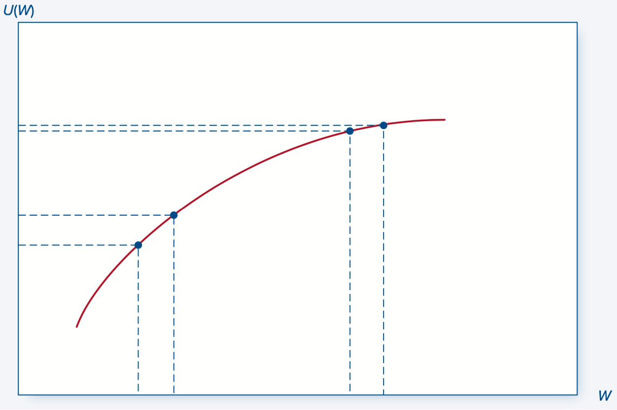 Bernoulli suggested that the value of money for a player depends on their existing wealth. Clearly, for someone with only 10 thalers, winning 1 thaler is more valuable than it would be for a millionaire. Thus, this win, although having the same monetary value, has different utilities for different players. The function that relates a player's wealth WW to their utility UU is called the utility function.