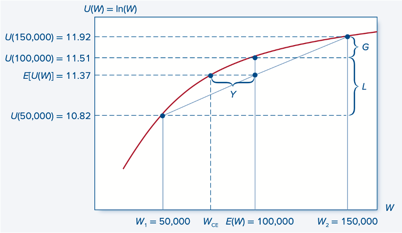 Now let's look at the situation from a utility perspective. Using a logarithmic utility function, the player's initial utility is 11.51. If they win, it increases to 11.92, and if they lose, it falls to 10.82. Hence, the expected utility (here, the simple average) is only 11.37, which is less than the initial value.